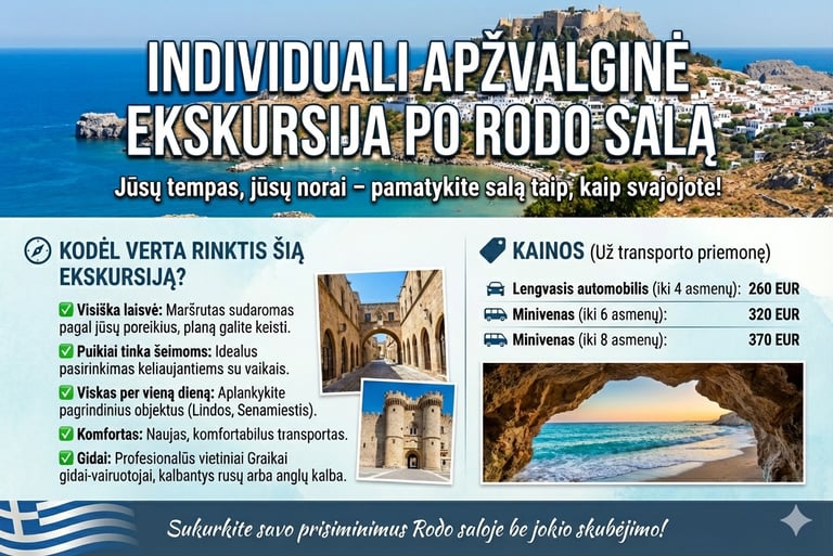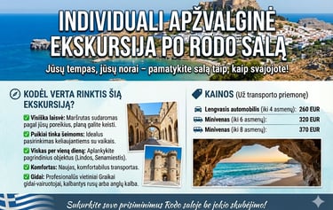 Automobilių nuoma, pervežimai, ekskursijos ir katerių nuoma Rodo saloje.